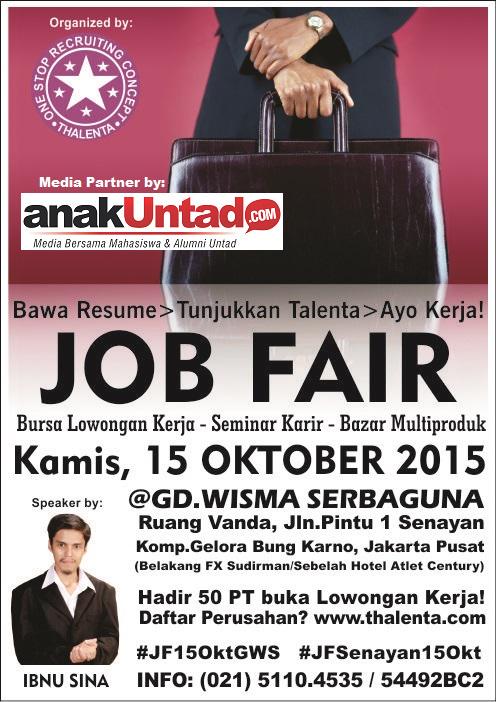 Job Fair Thalenta Expo adalah Acara Bursa Lowongan Kerja (Job Fair/Career Expo) Non-Profit yang diselenggarakan Event Organizer PT.Gapcer Sahabat Muda berperan aktif dalam membantu bangsa mengatasi masalah pengangguran, menjembatani penyedia kerja (Company) dengan para pelamar kerja (Job Seeker) serta membawa Dunia Kerja Indonesia ke Arah yang Lebih Baik. Acara ini akan dilaksanakan pada: